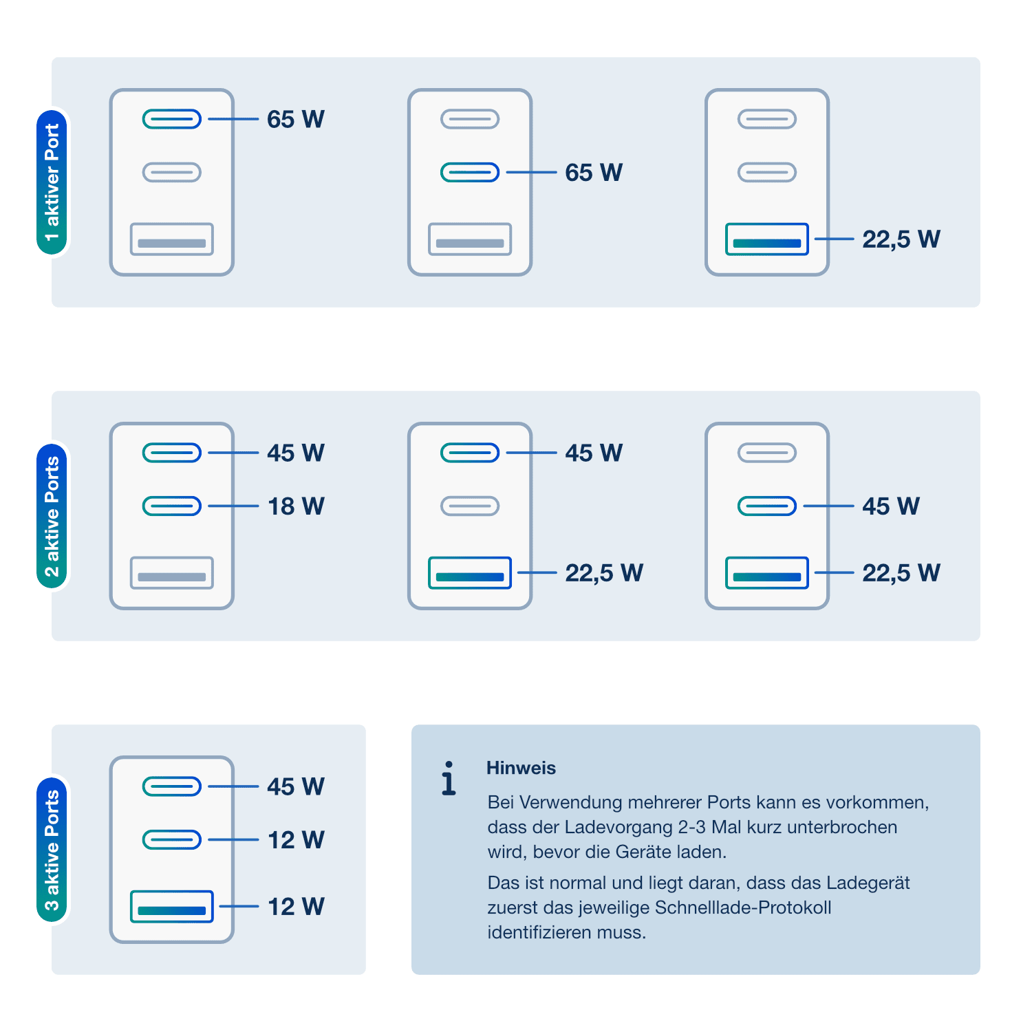 Mit 2 USB-C (bis zu 65 W) und einem USB-A (bis zu 22,5 W) Ausgang ist unser 65 W Schnellladegerät dein idealer Begleiter.