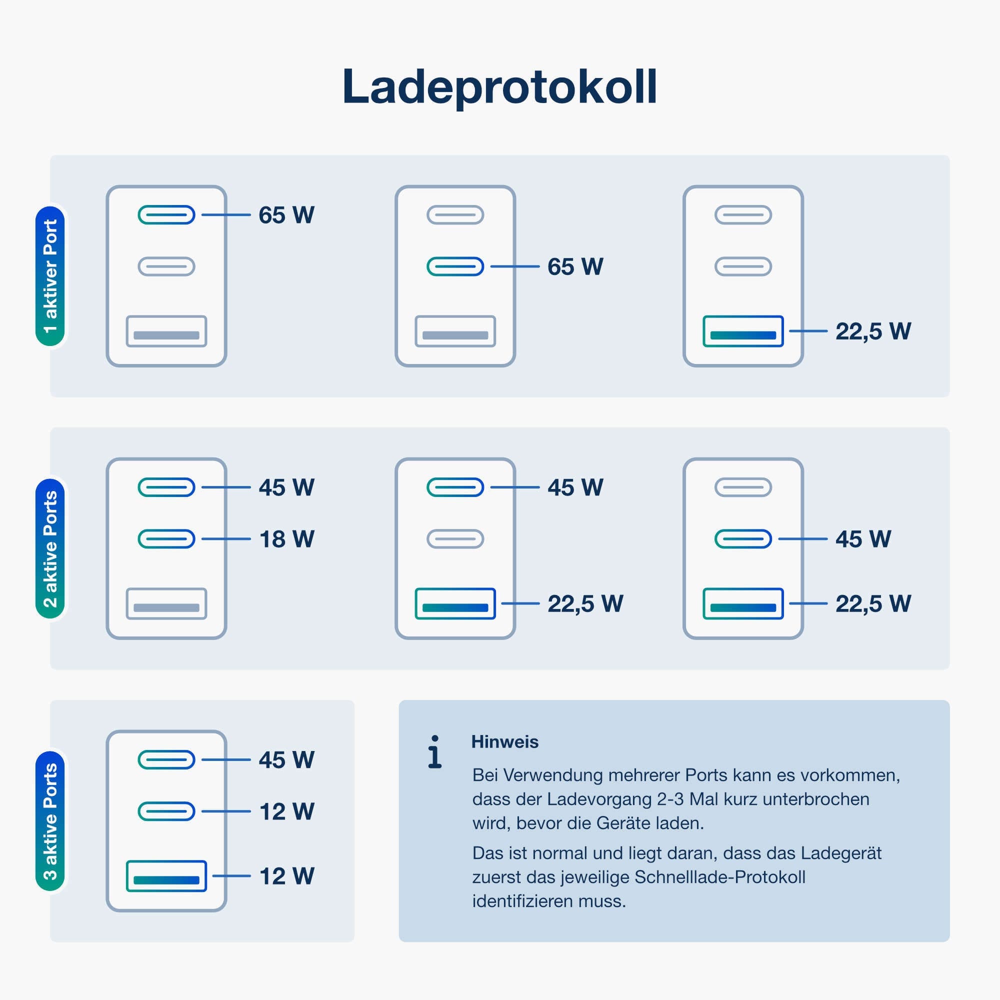 Dank fortschrittlicher Schnellladetechnologie erkennt das Ladegerät automatisch den Energiebedarf deiner Geräte und passt die Leistung optimal an. USB Power Delivery (PD) und PPS sorgen für effizientes, sicheres und blitzschnelles Laden – egal ob Smartphone, Tablet oder Laptop. Die intelligente Leistungsverwaltung stellt sicher, dass jedes Gerät genau die Power bekommt, die es benötigt, ohne Überhitzung oder Energieverlust.